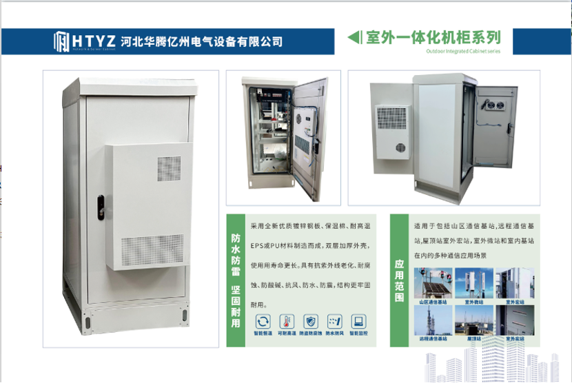 户外一体化智能柜,户外IP55防护等级设计,高效的节能减排,有效降低运营成本。防盗性能较强、噪音低、散热效果好、占用空间小的产品。户外一体化机柜广泛应用于通信运营商的移动通信站点、户外小型方舱、铁路电气控制柜、通讯基站、室外空气监测站、高速取卡机控制柜等。