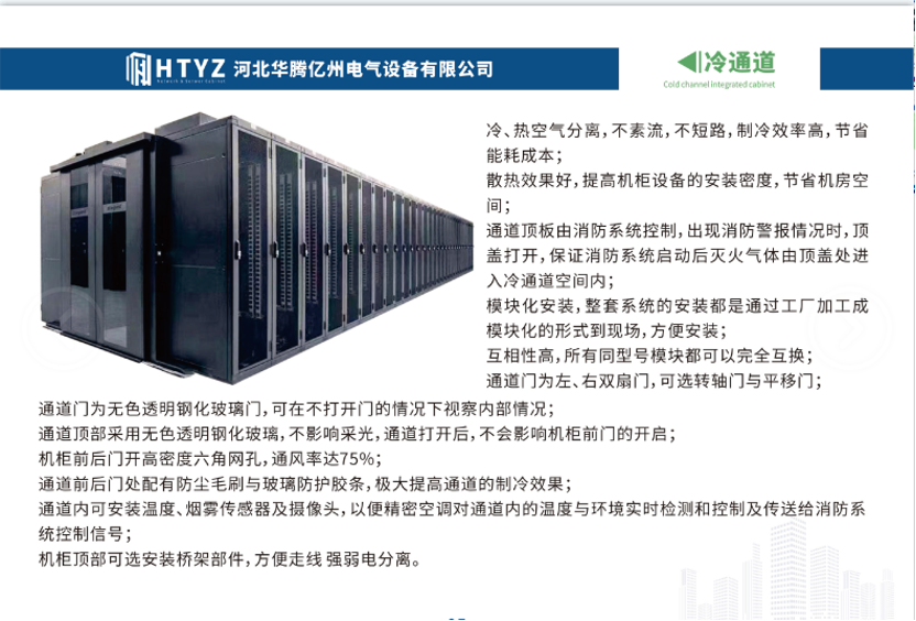 河北华腾亿州电气设备有限公司成立于2019年9月,位于北京与天津交界处,地处香河县东部,交通方便、通讯便捷,是一家及科研、生产、销售与一体的省高新技术企业,同时是廊坊市模块化机柜散热技术研发中心,并于2020年获得河北省质量诚信AAA品牌企业,于2021年获得多项实用新型专利证书,所生产产品通过ISO9001:2015质量管理体系认证。年产量数万台,销售额高达上亿元,客户遍布华北、东北、西北及长江以北流域。