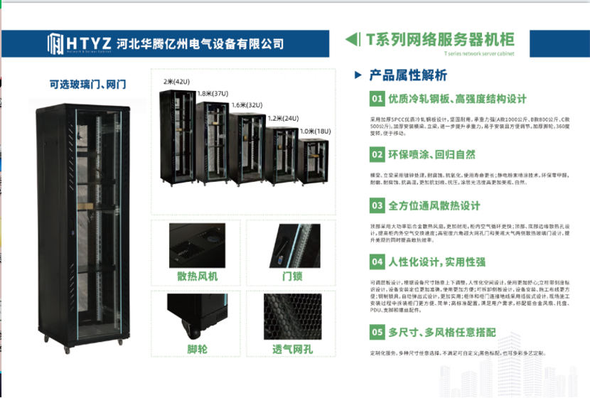 此外,公司为了满足客户对更前沿技术、更有竞争力成本、更高性能产品的需求,在技术研发创新、高端制造等方面开展了大量的工作。一是注重技术实力积累,产线自动化程度高、生产产能充沛,华腾机柜”目前分别在河北香河、天津市宝坻区和湖北咸宁三地投产实体工厂,公司拥有现代化的生产基地,三地占地面积达5万余平方米,配备了先进的生产设备和自动化生产线。从原材料采购到产品出厂,每一个环节都严格遵循国际标准和质量体系进行把控,确保每一台网络机柜都具备卓越的品质和性能。我们的年生产能力达到50万台,能够满足不同客户的大规模订单需求。二是重视研发设计投入,目前已建立完善的研发体系、测试体系,我们高度重视技术创新和产品研发,拥有一支由资深工程师和技术专家组成的研发团队。他们紧跟行业发展趋势,不断探索和应用新技术、新工艺,致力于为客户提供更具创新性和竞争力的网络机柜产品。目前,公司已获得多项国家专利和技术认证,产品涵盖了壁挂机柜、服务器机柜、一体化智能机柜、电磁屏蔽机柜等多个系列,能够满足不同应用场景的需求。三是严格的质量控制体系,质量是企业的生命线,我们深知这一点。因此,公司建立了完善的质量控制体系,从原材料检验、生产过程监控到成品检测,每一道工序都进行严格的质量检验,确保产品质量的稳定性和可靠性。我们的网络机柜通过了 ISO9001 质量管理体系认证、CE 认证等多项国际权威认证,深受客户的信赖和好评。对于规模不大、IT 设备数量相对较少但又需要集中管理和保护设备的中小企业,资金和场地有限,一体化智能机柜可以高效利用空间,满足基本的设备运行需求。学校、教育机构、广告传媒、监控中心等用于管理网络设备、服务器、交通监控、安防监控和数据存储等服务器和存储设备。也可为为分散在不同地点的办公区域提供集中的设备管理和保护,满足远程站点办公需求。