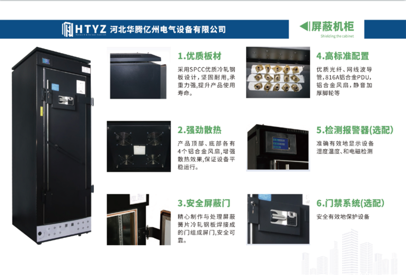 3. 电磁屏蔽机柜,达到《电磁泄漏发射屏蔽机柜技术要求和测试方法》C级屏蔽设备采用各种防电磁泄漏发射的手段,对涉密信息系统电磁泄漏发射危害有很好的作用,而屏蔽机柜就是其中的一种设备,具有体积小、安装方便、使用灵活的特点,非常适合在那些不适宜安装电磁屏蔽室又需要对信息设备提供保护的场合使用。屏蔽机柜得主要应用编辑屏蔽柜主要用于:防止计算机、网络服务器和通讯电子设备在运行中产生机要信息的泄露;防止上述设备在运行中受外界电磁波的干扰,保证其正常工作。应用于政府机关,国防,银行,证券,军队,教育,科研等的涉密等级需求较高的行业。